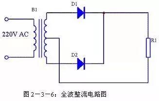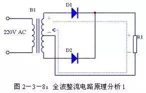 由于半波整流电路的效率较低,于是人们很自然的想到将电源的负半周也利用起来,这样就有了全波整流电路。全波整流电路图见图2-3-6。相对半波整流电路,全波整流电路多用了一个整流二极管D2,变压器B1的次级也增加了一个中心抽头。这个电路实质上是将两个半波整流电路组合到一起。