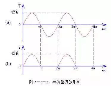 半波整流电路见图2-3-2。其中B1是电源变压器,D1是整流二极管,R1是负载。B1次级是一个方向和大小随时间变化的正弦波电压,波形如图 2-3-3(a)所示。0~π期间是这个电压的正半周,这时B1次级上端为正下端为负,二极管D1正向导通,电源电压加到负载R1上,负载R1中有电流通过;