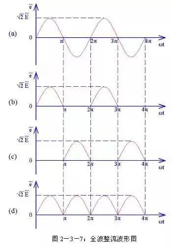 在2π~3π、3π~4π等后续周期中重复上述过程,这样电源正负两个半周的电压经过D1、D2整流后分别加到R1两端,R1上得到的电压总是上正下负,其波形如图2-3-7(d)所示。