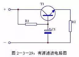 其电路形式见图2-3-29,其中电阻R1是三极管T1的基极偏流电阻,电容C1是三极管T1的基极滤波电容,电阻R2是负载。这个电路实际上是通过三极管T1的放大作用,将C1的容量放大β倍,即相当于接入一个(β+1)C1的电容进行滤波。