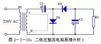 由图 2-3-19可知,在电源的正半周,变压器B1次级上端为正下端为负,D1导通,D2截止,C1通过D1充电,充电后C1两端电压接近B1次级电压峰值,方向为左端正右端负;