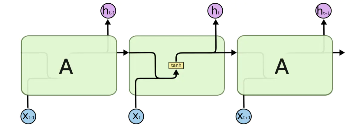 所有循环神经网络都具有神经网络的重复模块链的形式。 在标准的RNN中,该重复模块将具有非常简单的结构,例如单个tanh层。标准的RNN网络如下图所示