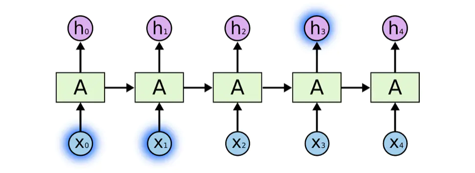 有时候我们需要利用近期的信息来执行来处理当前的任务。例如,考虑用一个语言模型通过利用以前的文字信息来预测下一个文字。如果我们需要预测“the clouds are in the sky”这句话的最后一个字,我们不需要其他的信息,通过前面的语境就能知道最后一个字应该是sky。在这种情况下,相关信息与需要该信息的位置距离较近,RNNs能够学习利用以前的信息来对当前任务进行相应的操作。如下图所示通过输入的
