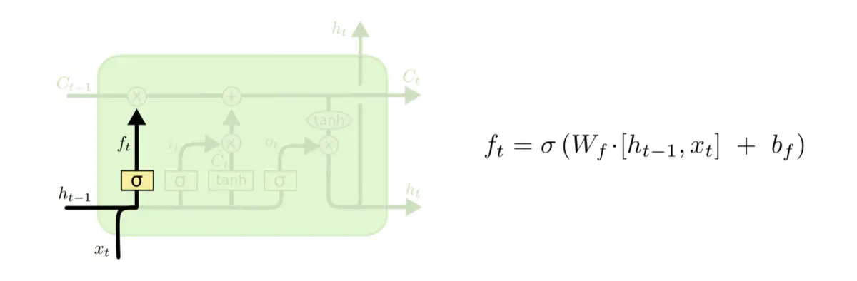 LSTM的第一步就是决定细胞状态需要丢弃哪些信息。这部分操作是通过一个称为忘记门的sigmoid单元来处理的。它通过查看