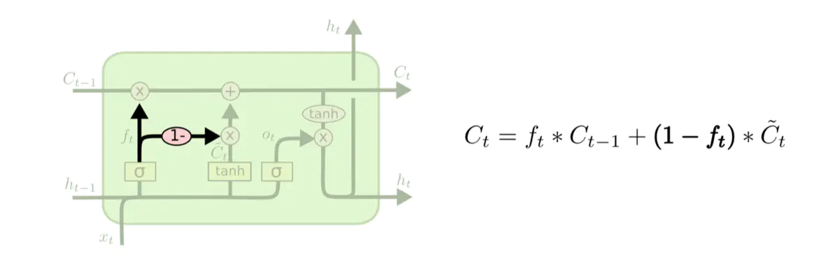 还有一种变式是在忘记门与输入门之间引入一个耦合。不同于之前的LSTM结构,忘记门和输入门是独立的,这个变式是在忘记门删除历史信息的位置加入新的信息,在加入新信息的位置删除旧信息。该结构如下图所示。