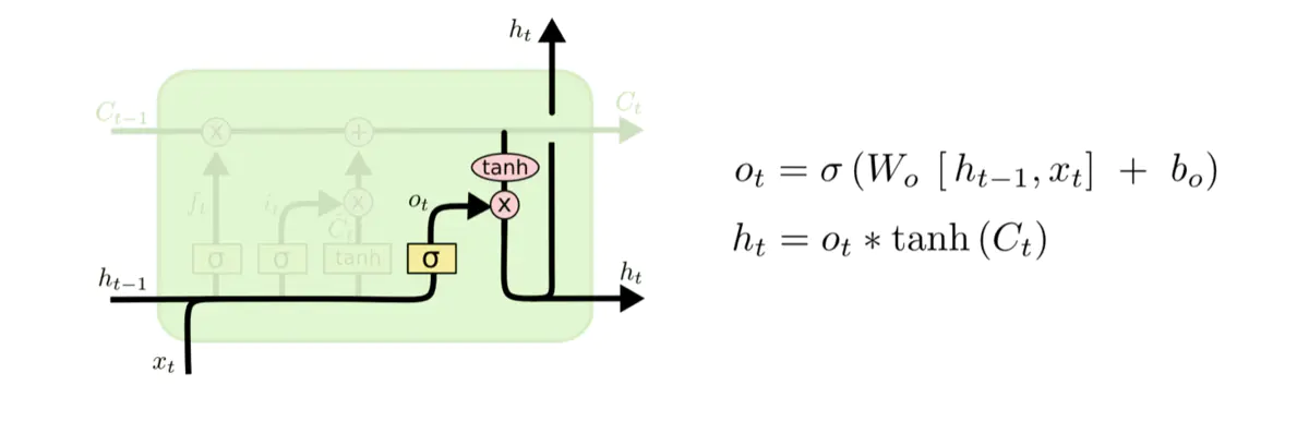 来判断输出细胞的哪些状态特征,这里需要将输入经过一个称为输出门的sigmoid层得到判断条件,然后将细胞状态经过tanh层得到一个-1~1之间值的向量,该向量与输出门得到的判断条件相乘就得到了最终该RNN单元的输出。该步骤如下图所示
