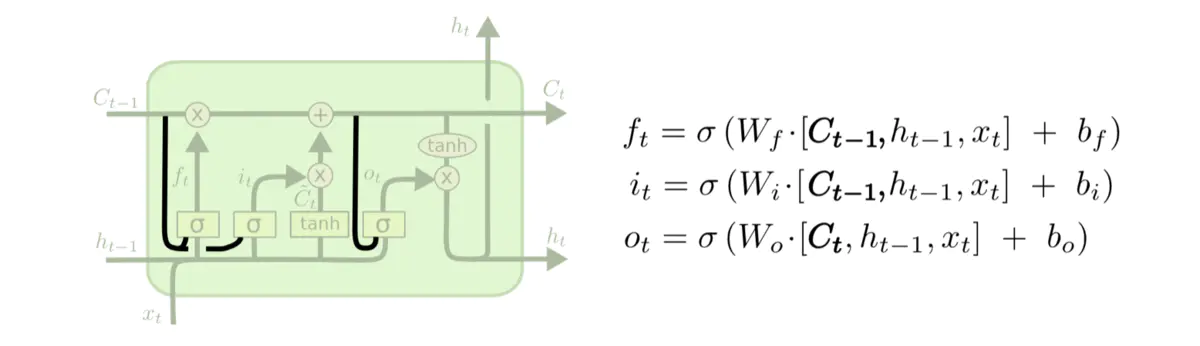 之前描述的LSTM结构是最为普通的。在实际的文章中LSTM的结构存在各种变式,虽然变化都不会太大,但是也值得一提。