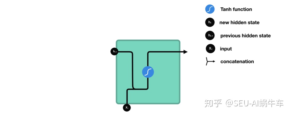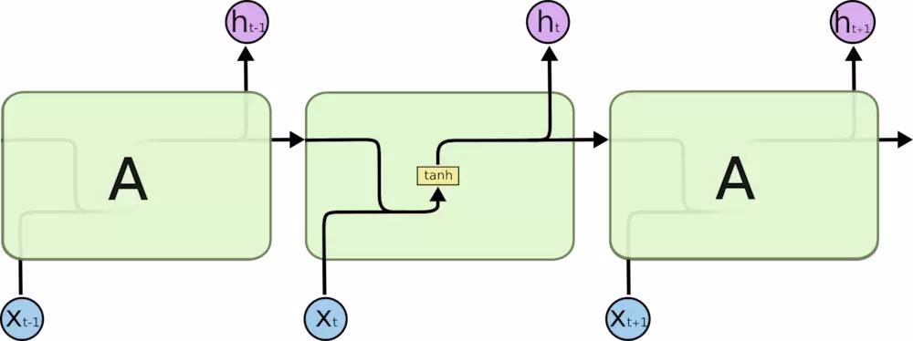 所有 RNN 都具有一种重复神经网络模块的链式的形式。在标准的 RNN 中,这个重复的模块只有一个非常简单的结构。