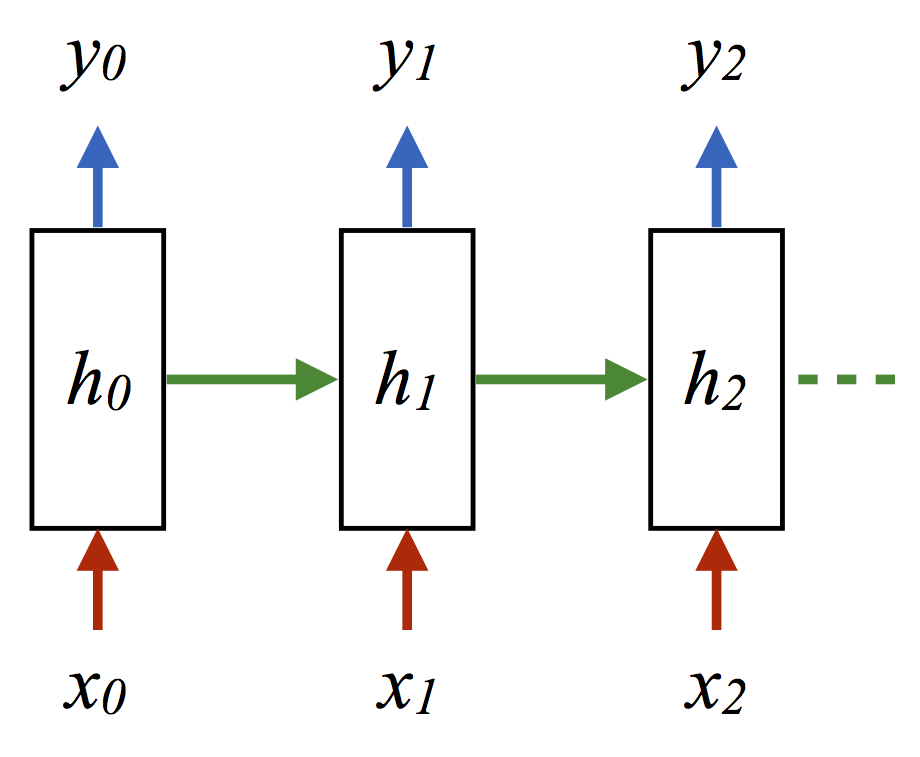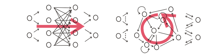 图, CNN(左)和RNN(右)的结构区别, 注意右图中输出和隐变量网络间的双向箭头不一定存在,往往只有隐变量到输出的箭头。