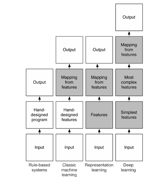 这张图简述了机器学习的发展,从最初的人工定义特征再放入分类器的方法一直到如今的deep learning。
