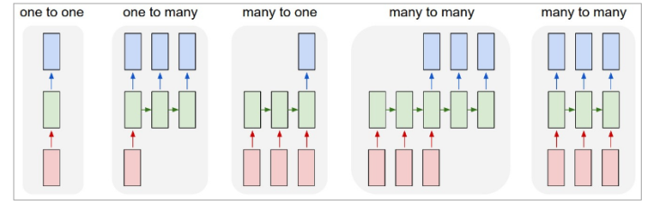图: 图1即CNN的架构, 图2到5是RNN的几种基本玩法。图2是把单一输入转化为序列输出,例如把图像转化成一行文字。 图三是把序列输入转化为单个输出, 比如情感测试,测量一段话正面或负面的情绪。 图四是把序列转化为序列, 最典型的是机器翻译,注意输入和输出的“时差”。 图5是无时差的序列到序列转化, 比如给一个录像中的每一帧贴标签。 图片来源 The unreasonableeffective RNN。