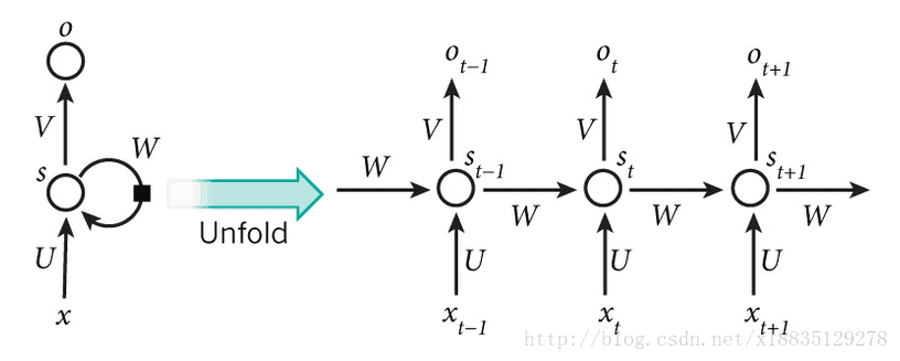 t-1,t,t+1时刻的NN,下标t表示时刻,x表示相应时刻下的输入,o表示相应时刻下的输出,s表示相应时刻下的状态,t时刻的输入会组合t-1时刻的状态以及t时刻的输入。