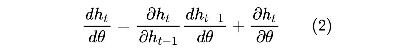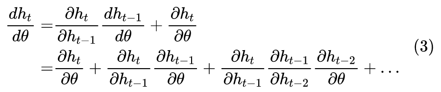 说到这里,我们还没说清楚一个问题:什么是 RNN 的梯度消失/爆炸?梯度爆炸好理解,就是梯度数值发散,甚至慢慢就 NaN 了;那梯度消失就是梯度变成零吗?并不是,我们刚刚说梯度消失是 一直小于 1,历史梯度不断衰减,但不意味着总的梯度就为 0 了,具体来说,一直迭代下去,我们有:
