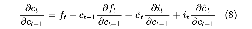 右端第一项 ,也就是我们所说的“遗忘门”,从下面的论述我们可以知道一般情况下其余三项都是次要项,因此 是“主项”,由于 在 0~1 之间,因此就意味着梯度爆炸的风险将会很小,至于会不会梯度消失,取决于 是否接近于 1。