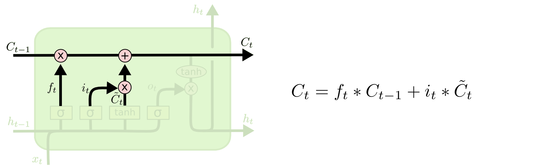 下面给出了LSTM的输入门和遗忘门,是如何作用到细胞状态的示意图,可以看到,遗忘门经过激活函数,是乘在细胞状态上的,如果选用sigmoid激活函数,sigmoid激活函数输出是0,1之间,乘在细胞状态上,就相当于对细胞状态进行了一种"遗忘"操作,其中0表示"完全遗忘"之前 t − 1 t-1 t−1个cell积累的状态值,1表示"完全保留"之前 t − 1 t-1 t−1个cell积累的状态值;而输出门是加在细胞状态上的,就相当于对细胞状态进行了一种"写入"操作。