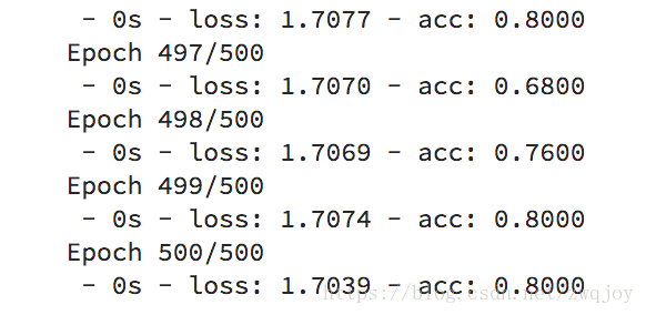 model.fit(X, y, nb_epoch=500, batch_size=1, verbose=2)