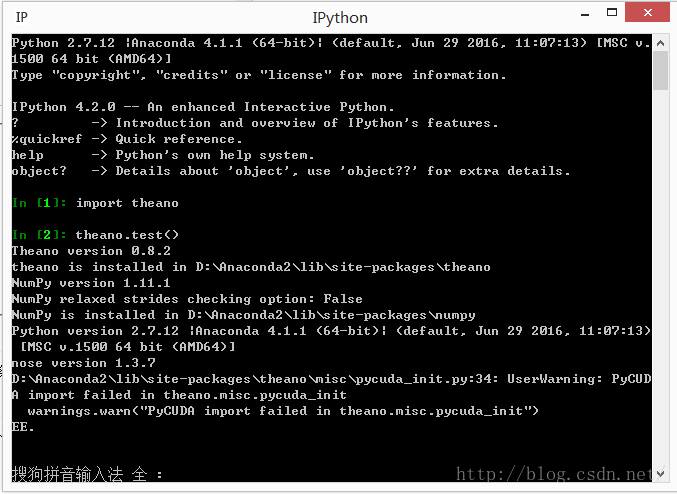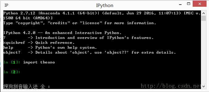 1)打开 anaconda 自带的 IPython ,输入import theano ,如果安装正确,会像下图一样: