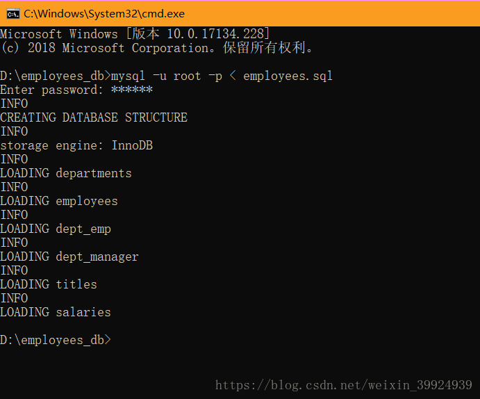 命令行输入:mysql -u root -p < employees.sql 然后输入密码,等待完成就好