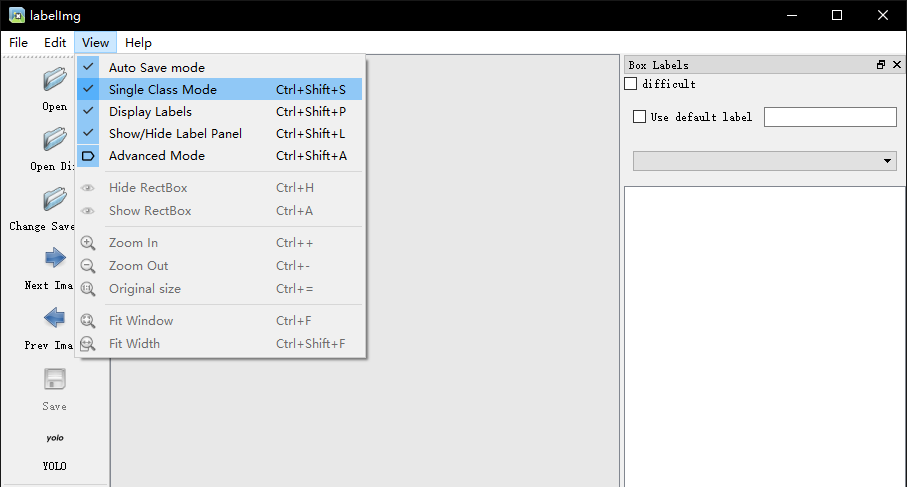 即可进入图片标注界面中来。进入之后,先把一些选项勾上,然后,最重要的是把标记模式改为yolo。
