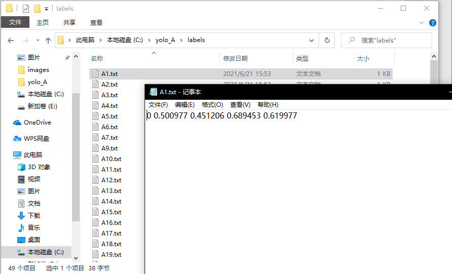 所有图片标注好之后,再来看labels文件夹,可以看到很多txt文件。每个文件都对应着我们标记的类别和框的位置: