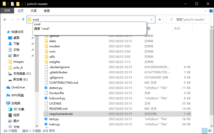 首先打开下载好的yolov5_master文件夹,在上面输入cmd回车,直接在该文件夹目录下打开命令行。