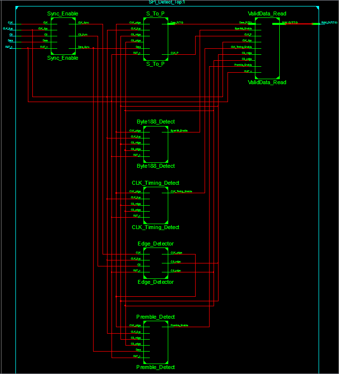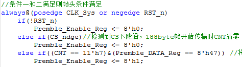 程序中可以看到,当两个条件都满足的时候,条件Premble_Enable_Reg置1,即头字节为0x47这个条件已经满足了。还有个问题就是我们需要将这个使能变量输出,因为它需要在下一个188byte都一直保持着有效,这样才能实现对已经存储下来的一帧数据进行持续的读取。可以通过在CS的上升沿即一帧传输结束之后,将Premble_Enable_Reg赋给最终的使能信号Premble_Enable,这样就可以实现在下一帧满足可读条件的时候,读使能一直有效