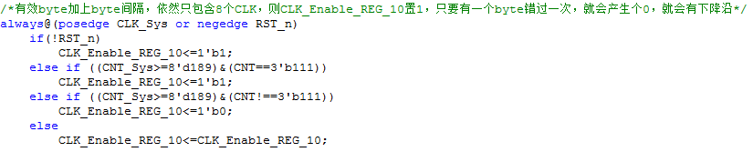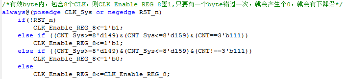 在规定的8个CLK时间的最后1个CLK的后半个周期(即CNT_Sys的值在149和159之间)含有8个CLK,则说明1个byte内含有均匀的8个CLK。这时置CLK_Enable_REG_8为1。我们发现,只要每个byte都是均匀传送的,CLK_Enable_REG_8就一直为1,所以只要产生错误,CLK_Enable_REG_8会置0,即产生一个下降沿。