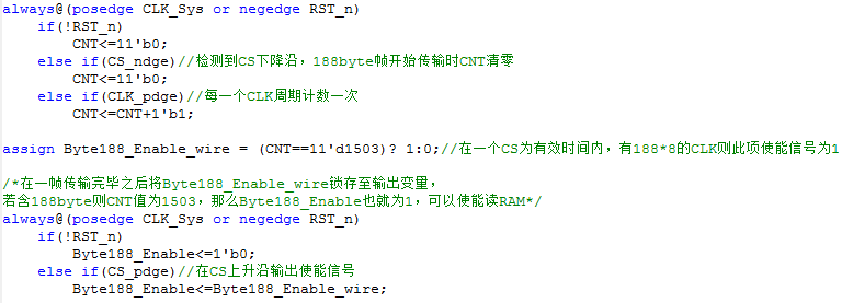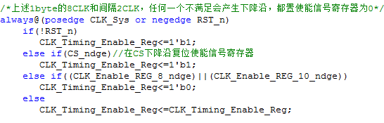 由程序中可得,当不产生下降沿时,使能信号保持为1,即有效。最后将这个变量再CS的上升沿即188byte传输完毕的时候赋给最终的使能信号CLK_Timing_Enable。如下: