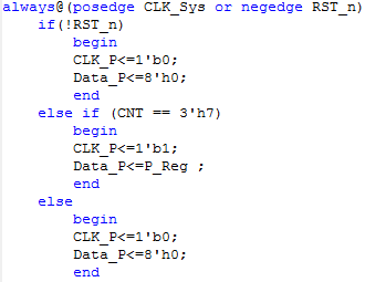 程序中可以看到,在CNT为7即产生了8个上升沿之后将并行变量P_Reg中的数据赋给Data_P用于输出,同时生成一个并行时钟CLK_P。