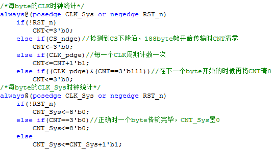 CNT在下一个byte开始时候清0,CNT_Sys在一个byte传输完毕后清0。下面就需要判断在8*20=160个CLK_Sys周期内是否含有8个CLK了,程序如下: