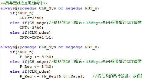 头字节检测,有两个分点需要去检测,一个是第一个字节,一个是是否为0x47。所以类似第二点中,一个是周期的统计,还有一个是对串行数据串并变化看第一个byte是否为0x47。相应程序如下: