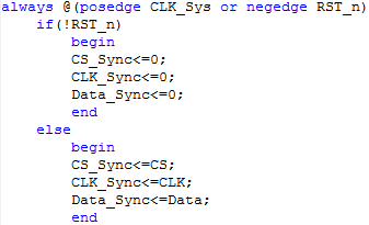 其实在进行上述的诸多操作之前首先需要进行的一个操作时同步处理,因为接口的时钟CLK是外部提供的,系统时钟CLK_Sys和CLK是不同步的,需要进行同步处理,通过D触发器实现。对CS、CLK、DATA均做下处理,如下所示: