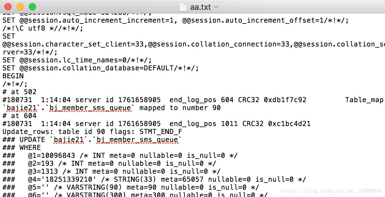 $ ./mysqlbinlog -vv --base64-output=decode-rows /Users/xubin/mysql-bin.000145 -v > /Users/xubin/aa.txt