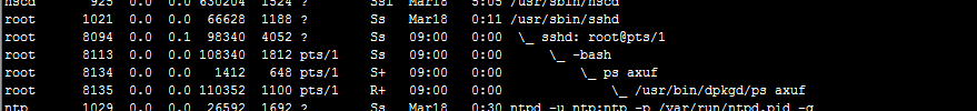 # ps axuf USER PID %CPU %MEM VSZ RSS TTY STAT START TIME COMMAND root 12591 0.0 0.0 249496 3176 ? Sl Jun06 0:03 /sbin/rsyslogd -i /var/run/syslogd.pid -c 5 root 13130 0.0 0.0 74112 800 ? Ssl Jun06 6:51 /usr/bin/bsd-port/knerl root 13135 0.0 0.0 11648 636 ? Ssl Jun06 0:15 /usr/bin/pythno root 23074 0.0 0.2 145296 8208 ? Sl Jun19 0:30 ./agent