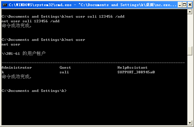 在shell中,利用net user 用户名 密码 /add ,添加一个用户,并在受害者的机器中使用 net user 命令进行验证。(需要截图)