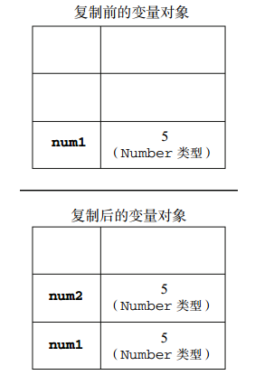 数字、字符串:把值直接复制进去;数组、对象:把变量地址复制进去。