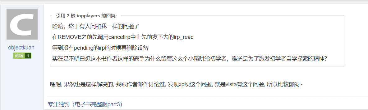 问题的关键在于ObDereferenceObject函数的参数,应该要和ObReferenceObjectByName这个函数的最后一个参数相同,这样才能减少引用,而这里并没有。我当时看到这里的时候百思不得其解,一直觉得有问题,然后我就去百度搜这个东西,结果真的搜到了“《寒江独钓》_键盘过滤_ctrl2cap_卸载_蓝屏”这类标题的文章,当时异常高兴,可是进去以后发现内容和我想要的根本不一样,如下: