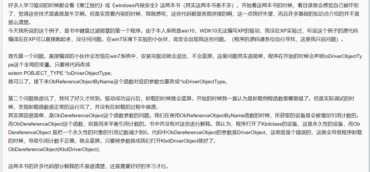 国内有关于windows内核驱动这块的书籍实在是甚少,不过好在《windows内核安全与驱动开发》这本书还算不错(内容方面),但是不得不说这本书在许多地方存在着一些细节上的问题。比如我今天要谈的这个话题。