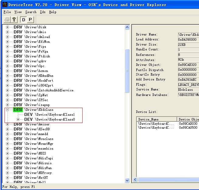 我们的目的就是将自己的驱动设备挂接/driver/kbdclass驱动下的全部设备,如图所看到的: