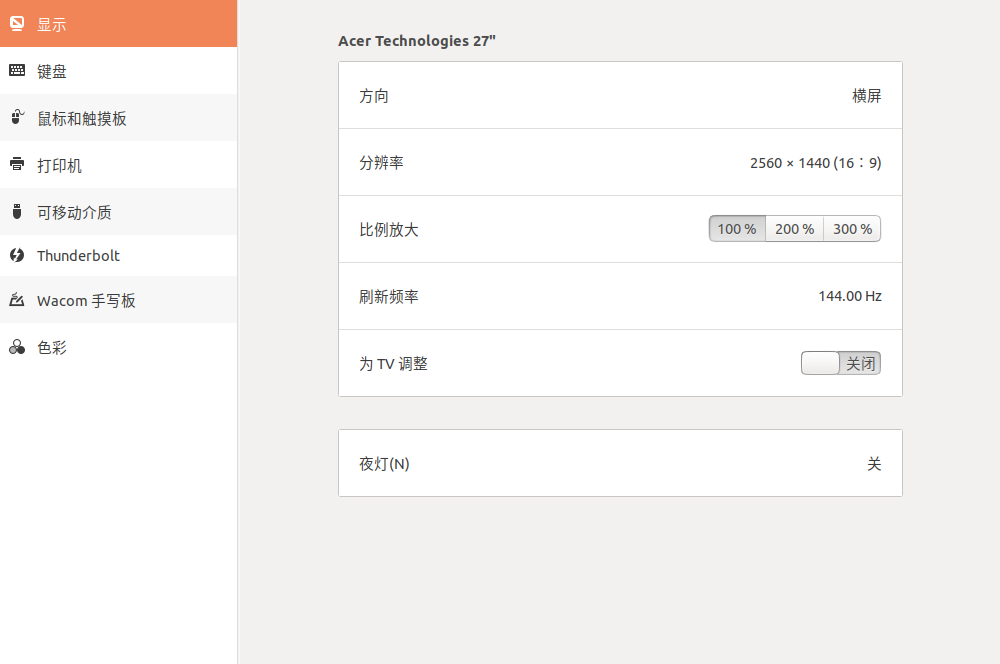 重新进入系统,设置中的设备-显示就能快乐地调节分辨率和刷新频率了