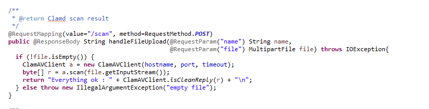 clamav 作为开源的杀毒程序,可以直接对本地文件进行定期杀毒扫描,也可以启动杀毒服务,由远程程序调用服务将文件传输过来,扫描后返回是否为病毒的状态,可用于业务系统中文件上传后调起远程扫描,达到嵌入业务系统的目的。