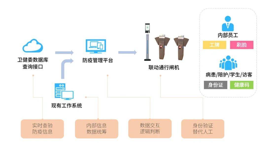国内疫情多发,疫情防控形势严峻。医院、学校、商场、写字楼等公共场所日常人流量大,核验健康码、核酸数据、测体温、来访登记等一整套查验流程繁琐复杂,防控管理难。即使投入大量人力,入口处仍然会排起长龙,通行效率和防控精准度得不到提升。