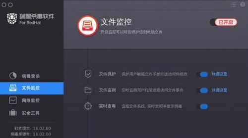 “文件监控”是瑞星推出的国内首家在Linux 环境下的监控功能,包括:文件保护、文件监测和实时查毒。它可以保护用户敏感文件不被非法访问和修改,系统中任何尝试修改或访问该文件的操作都会被告警或阻止。同时,能够实时监测管理员指定的程序访问文件事件。并且对于发现的病毒文件进行实时查杀,并记录相关日志,让管理员实时了解自身Linux环境的安全状况。