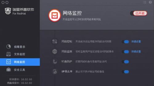 瑞星杀毒软件Linux全功能版为用户提供网络控制和网络监测功能。它允许管理员控制正在运行的进程或可执行的程序是否可以使用网络,只有管理员允许使用网络的进程可以进行正常的网络通讯,被禁止的程序和进程将不能够访问网络。并且可以记录些正在运行的进程或可执行文件对网络的使用事件,所有事件日志都将记录在“日志中心”的“监控日志”当中,提供管理员随时查询。
