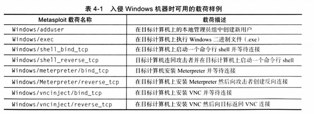 Payload:攻击载荷,是将目标机器变成木偶,强制它按照我们的指挥行动的一种方法,可以改变软件的原有功能,使我们可以为所欲为,例如安装新软件,禁用运行的服务,添加新用户,在受害系统上打开后门等。
