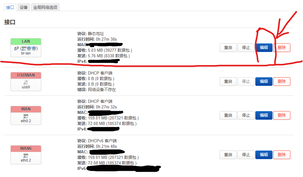 然后在里面找到LAN 和 WAN 两个接口,首先对LAN接口进行配置