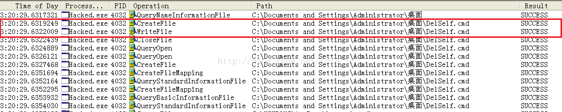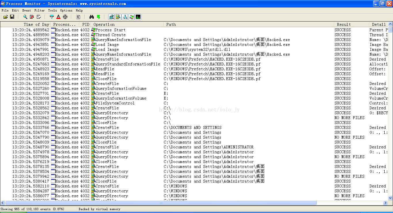 运行“Hacked.exe”程序,此时ProcessMonitor已监控到该程序相应的操作,如下图所示:
