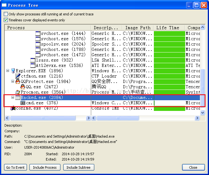 可见“Hacked.exe”自身还启动了cmd.exe程序,那么如果有必要的话,还应当对其进行监控。