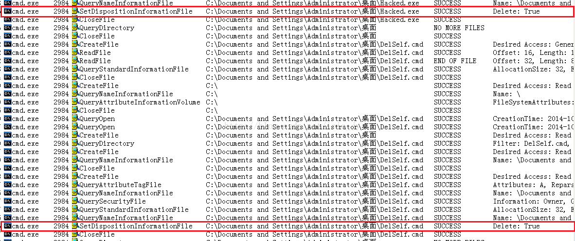 这里创建了DelSelf.cmd文件,并且对其进行了写入操作。至此,我们并未发现“Hacked.exe”有删除自身的行为,那么有必要对cmd.exe进行监控。结果如下: